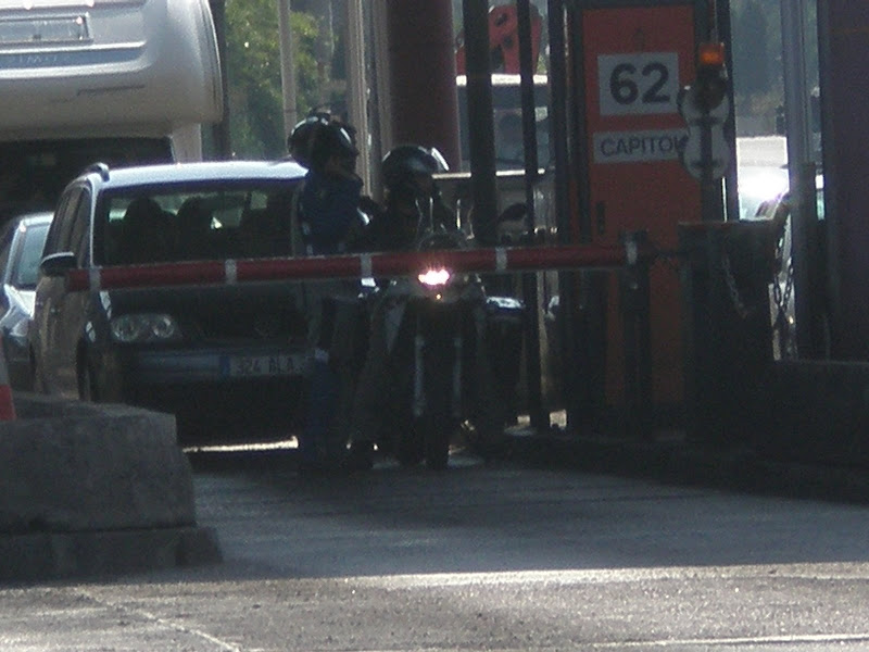 De repente la autopista está completamente atascada. Los coches ni se mueven y no sabemos por qué ha sido, pensamos que es un accidente. Con mucho cuidado y aprovechando que vamos en moto, sorteamos los 11 kilómetros de atasco y finalmente llegamos al punto causante de tal caos: el peaje. No me lo puedo creer.